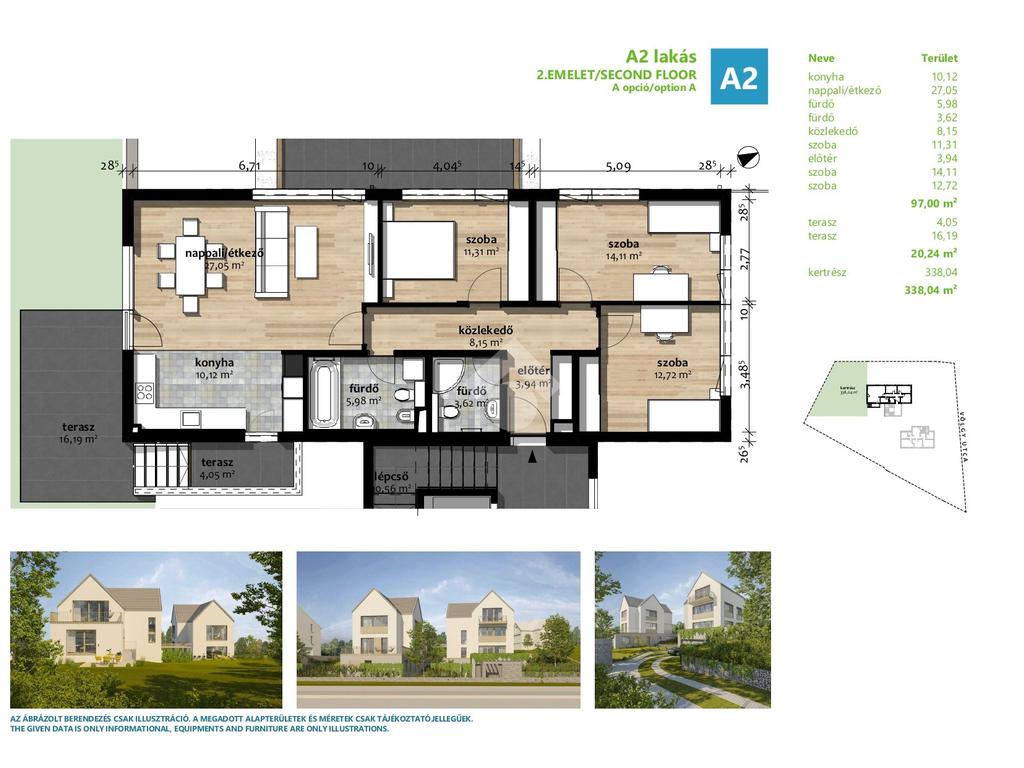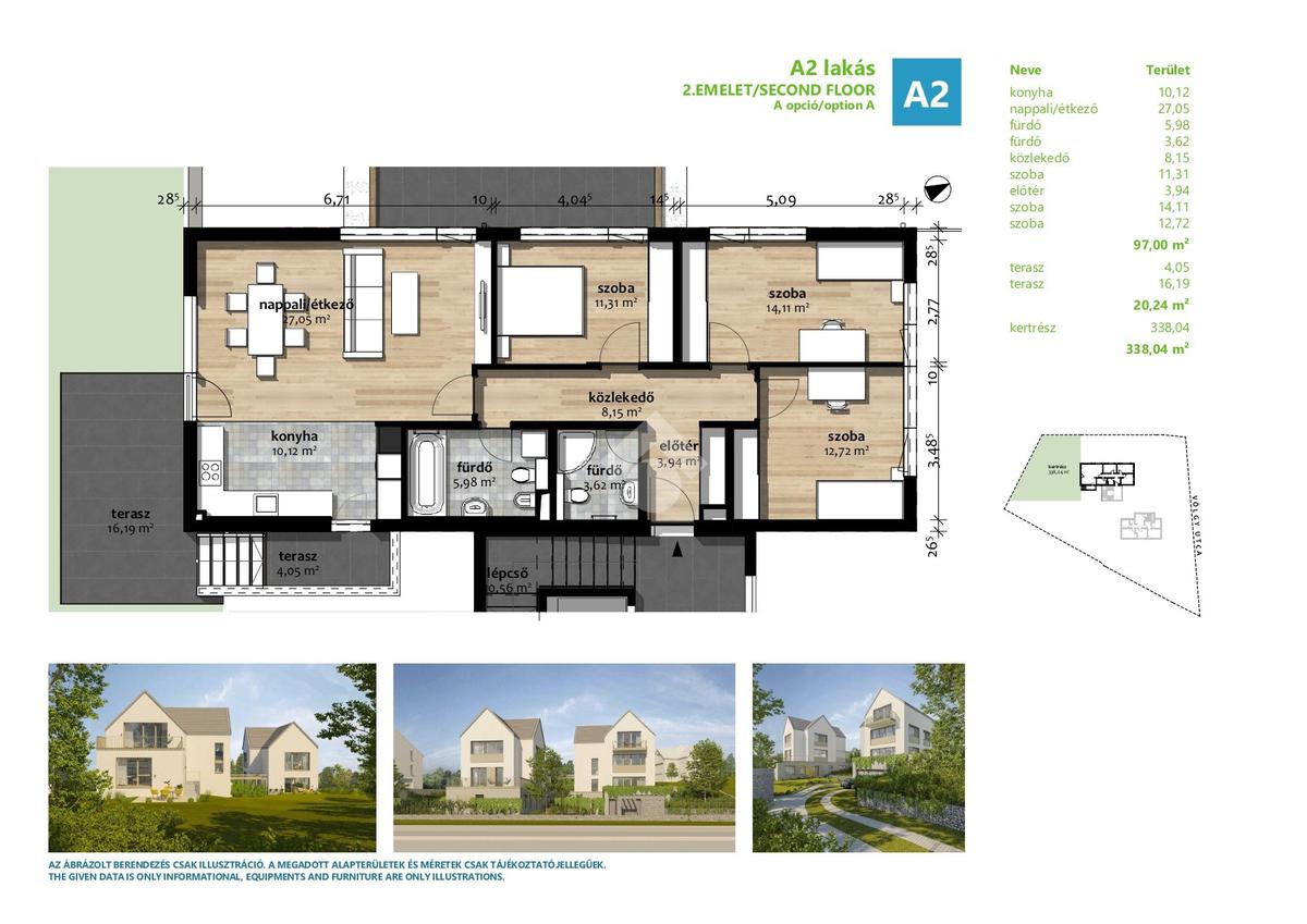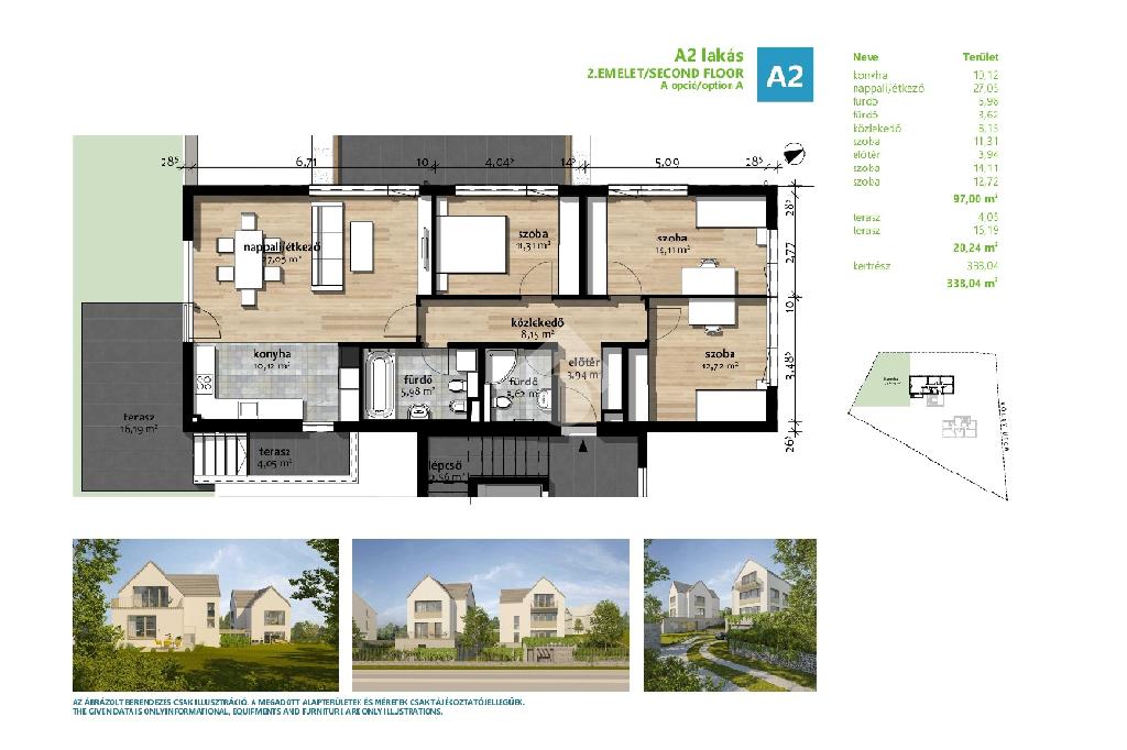 Az eladásra kínált lakás a társasház középső lakása, mely amerikai konyhás nappaliból, 3 hálószobából és 2 fürdőszobából áll. A nappaliból nyílik egy 20nm-es napfényes, kertkapcsolatos terasz. A természetközeliséget tovább fokozza a lakáshoz 338nm-es kizárólagos használatú kert.