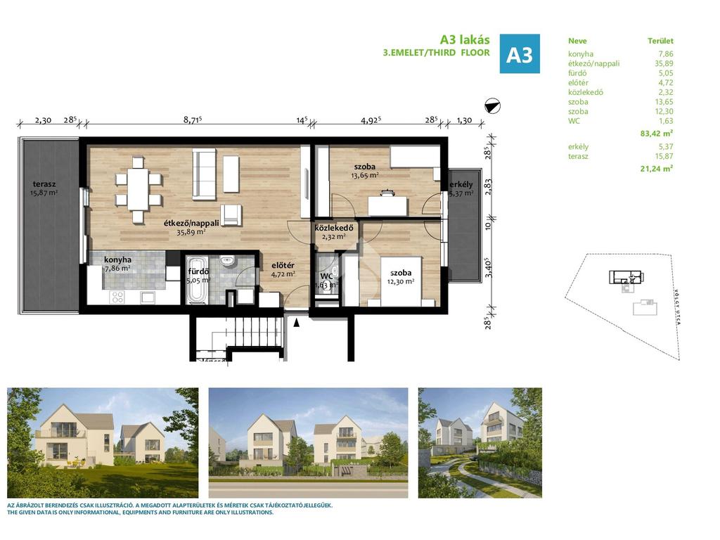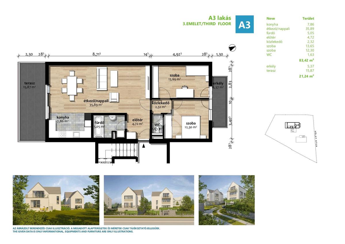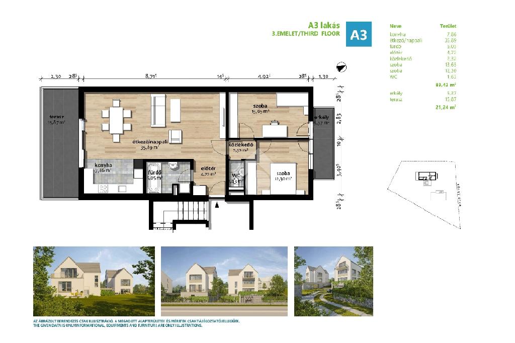 Az eladásra kínált lakás a társasház legfelső lakása, mely amerikai konyhás nappaliból, 2 hálószobából, fürdőszobából és külön wcből áll. A hálószobákból nyílik egy 5nm-es erkély, illetve a nappaliból nyílik egy 16nm-es napfényes terasz. A lakás ugyan tetőtéri, de a tervezéskor gondoskodtak a jól bútorozhatóságról, ezért a térdfal 1,70cm.