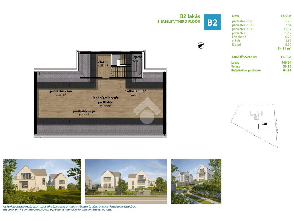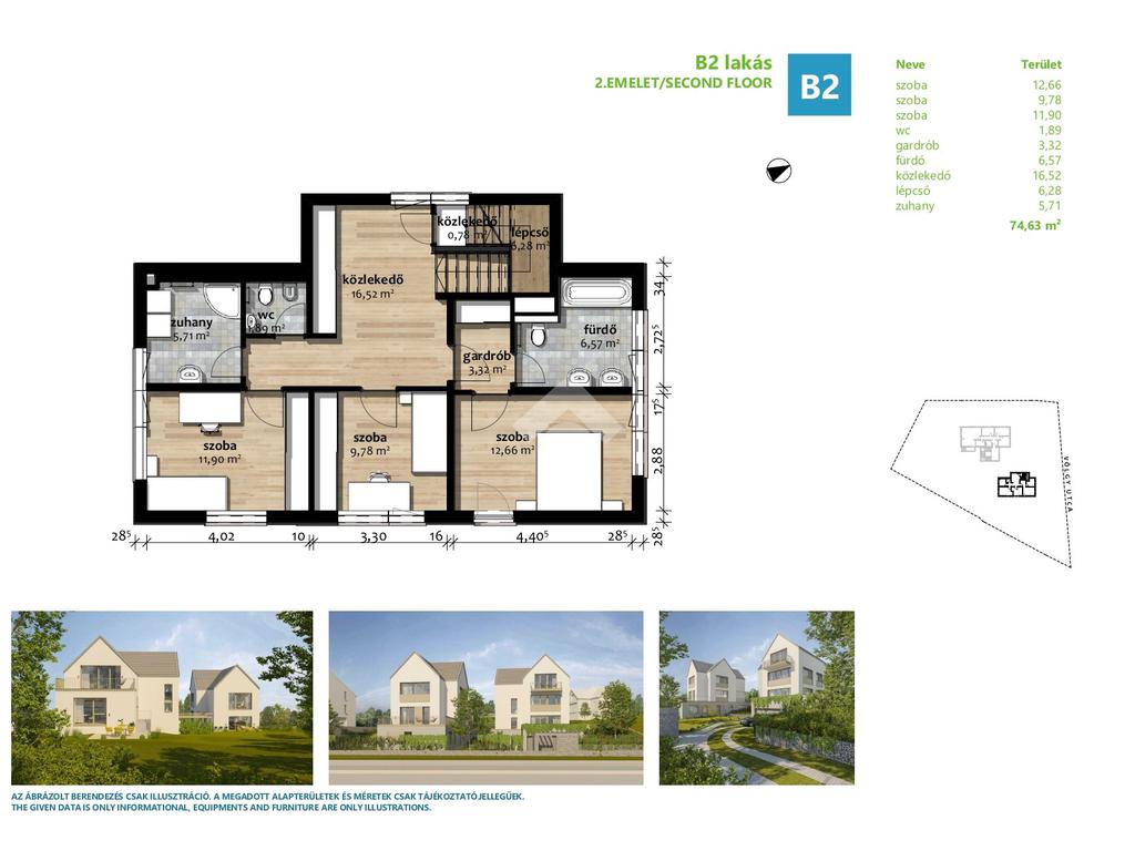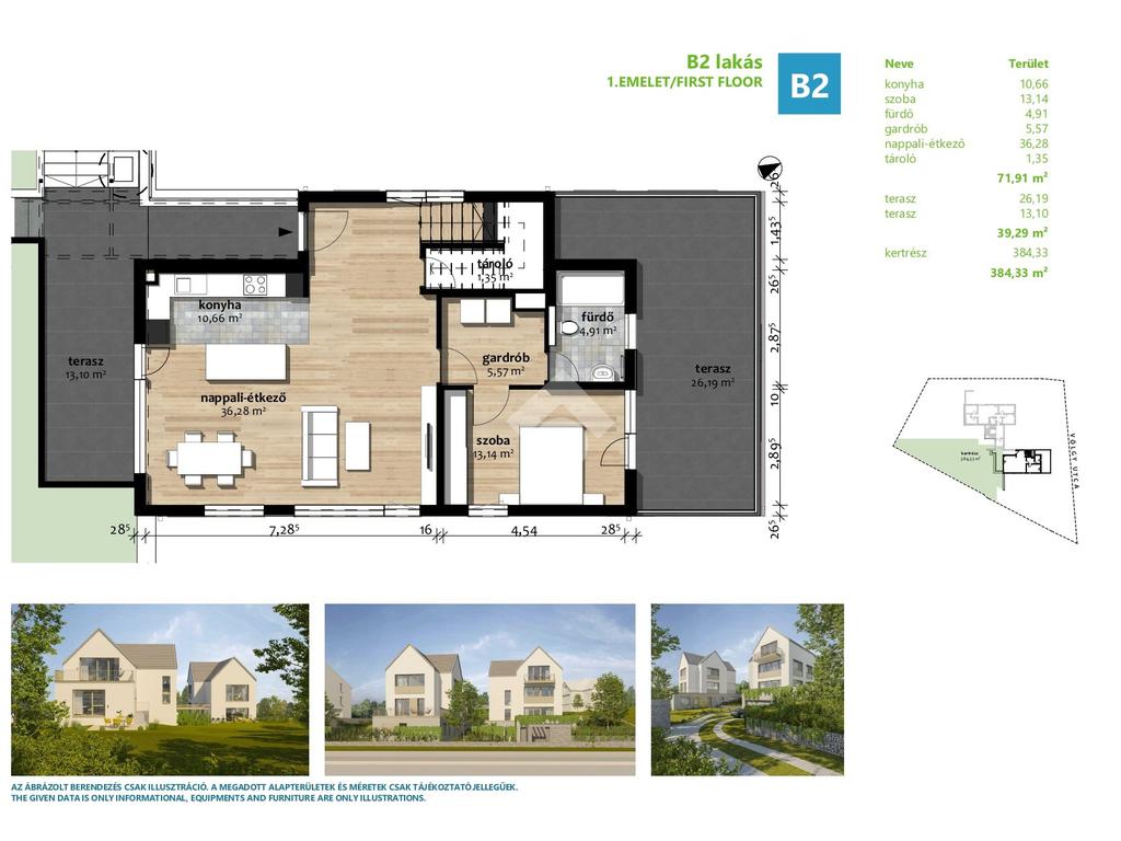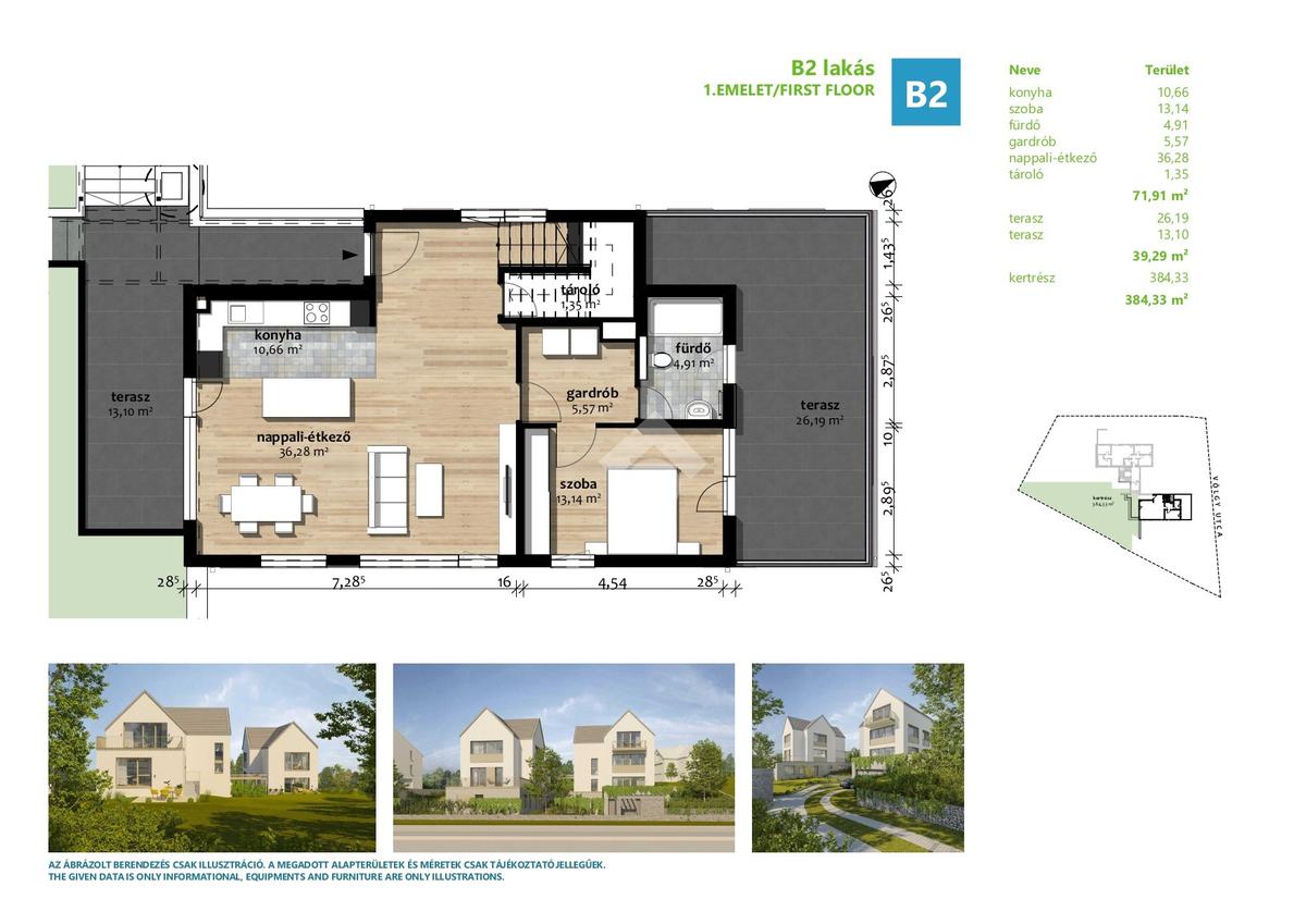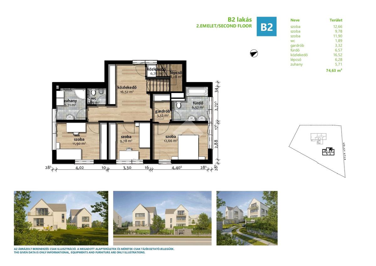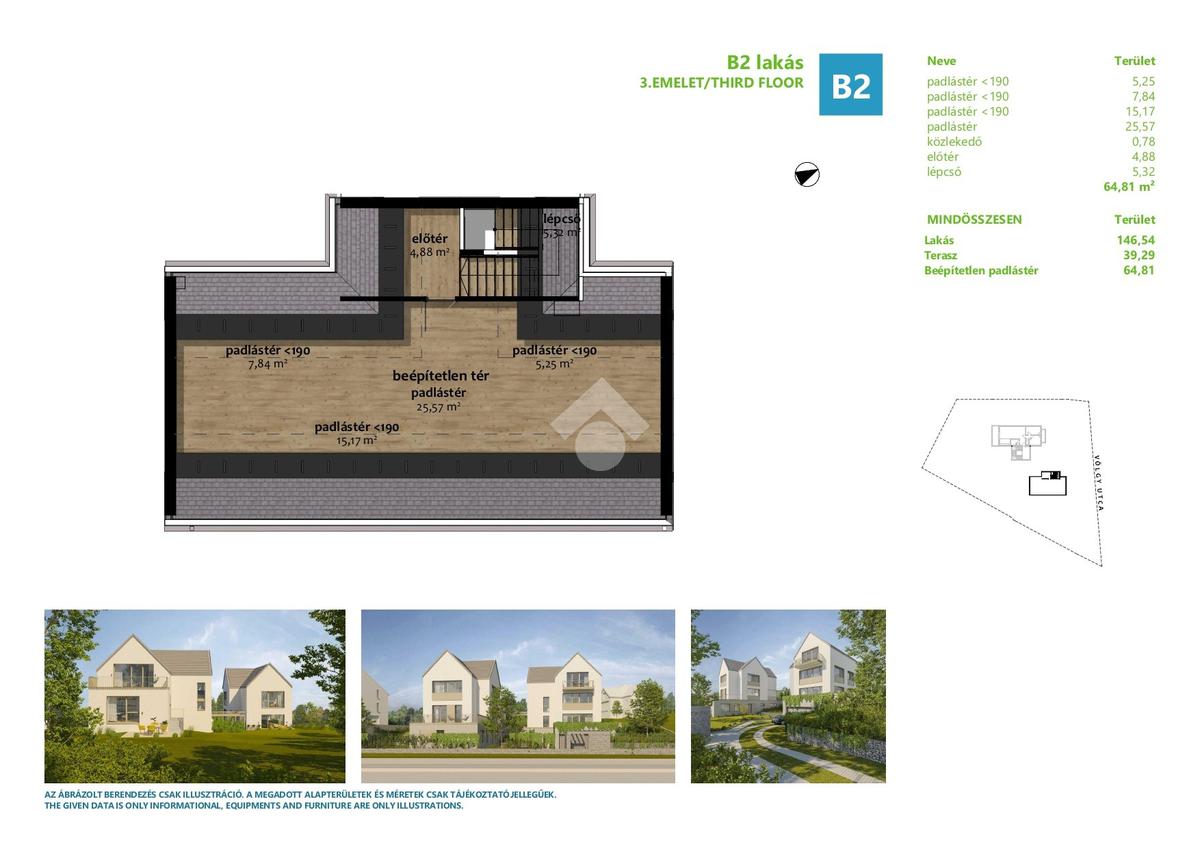 Az eladásra kínált lakás belső 2 szintes és egyben a legfelső emeleti lakása. A bejárati szinten található egy amerikai konyhás nappali, 1 hálószoba gardróbbal és egy fürdőszoba. A nappaliból nyílik egy 13nm-es napfényes, kertkapcsolatos terasz, a hálószobából pedig egy 26nm-es terasz. Az emeleten található 3 hálószoba, melyből az egyik saját fürdőszobával és gardróbbal rendelkezik. Ezenkívül található még egy fürdőszoba és egy külön wc. A természetközeliséget tovább fokozza a lakáshoz tartozó 384nm-es kizárólagos használatú kert. A lakásból nyílik egy bruttó 65, nettó 25nm-es beépítetlen padlástér, ami leszigetelt, fűtött és minden közmű előkészítéssel rendelkezik.